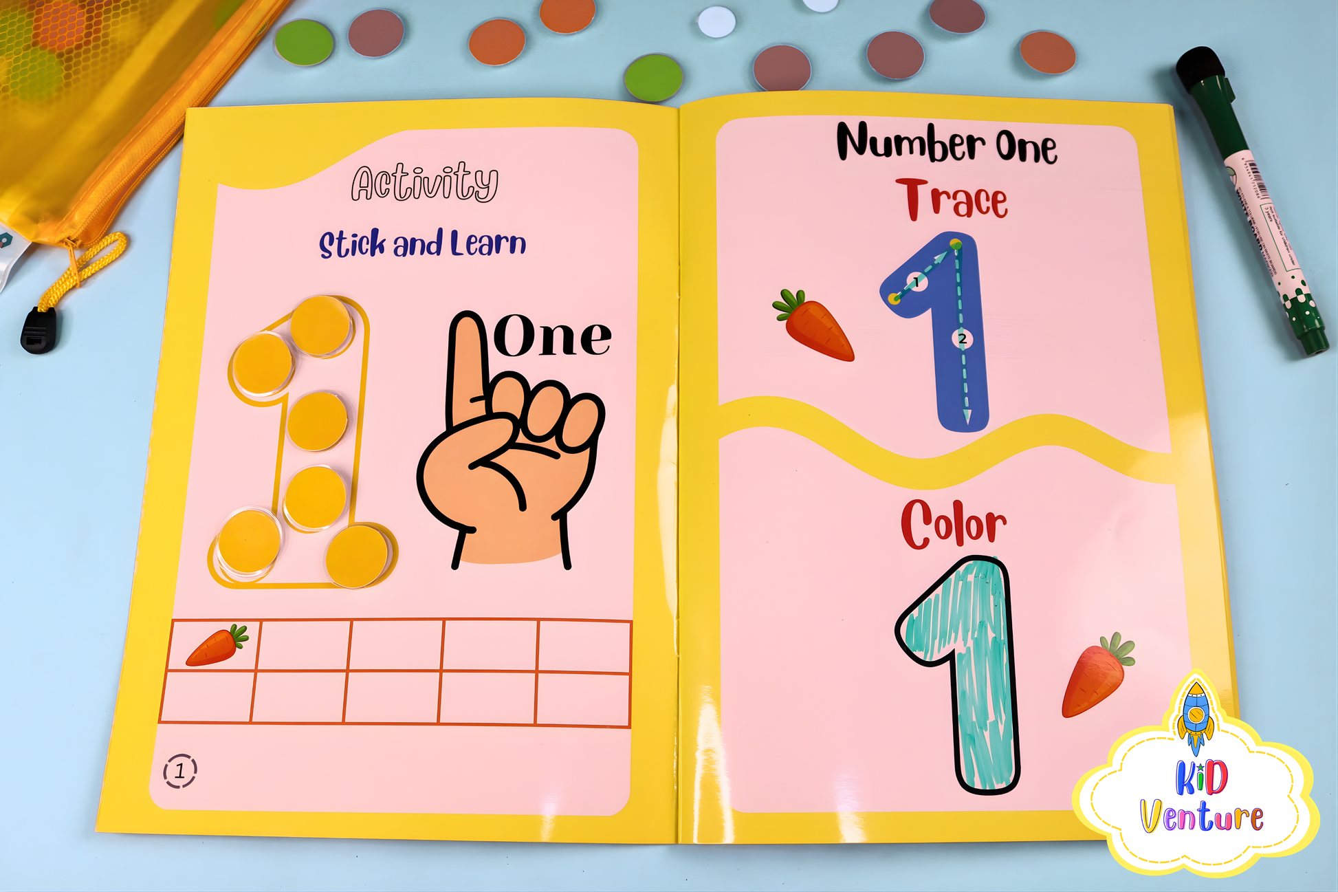 Numbers Book: Teaches counting 1–10 through tracing, coloring, and playful activities.